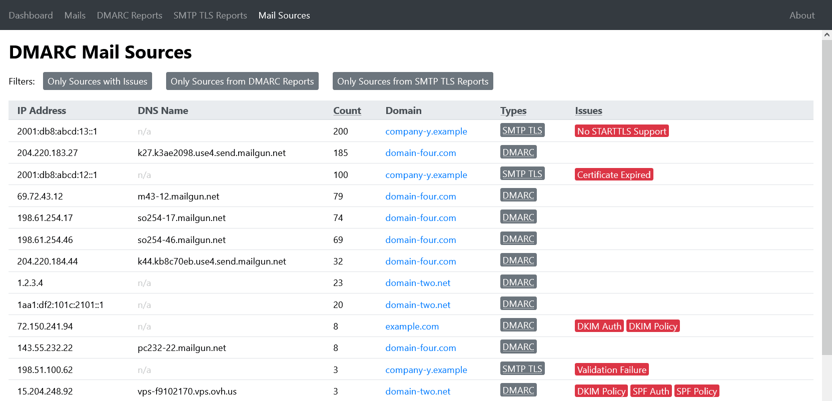 DMARC report viewer is a self-hosted solution designed to parse and visualize DMARC aggregate reports. It provides a foundational set of features for understanding DMARC compliance, identifying email sending sources, and detecting potential spoofing attempts.